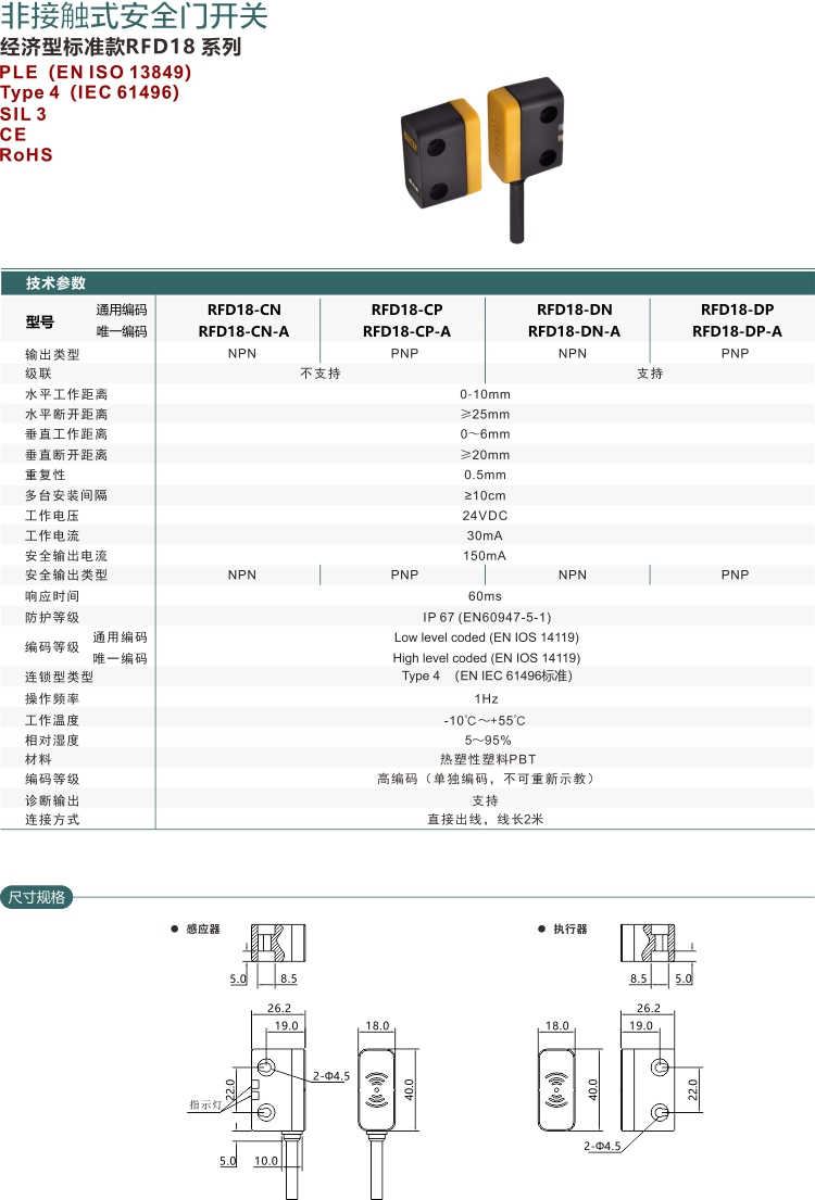 非接触式安全门开关采用无线射频识别应用技术,无论周围发生何种变化,都要安全地进行开关,非接触式安全开关工作稳定可靠。可以根据风险评估和机器设计的要求使用。