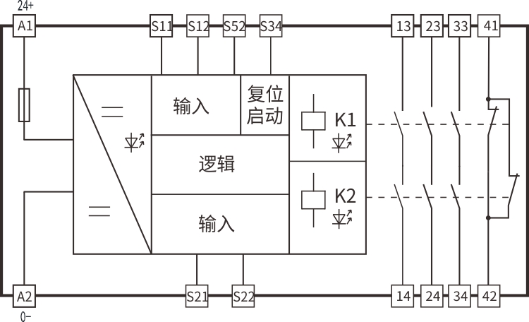 SRS-226-2N/P-3NO1NC是一款适用于具有开关量的安全产品输入,具有3路常开(NO)安全输出触点和1路常闭(NC)辅助输出触点的安全继电器。它可选择单/双通道操作,手动/自动复位。