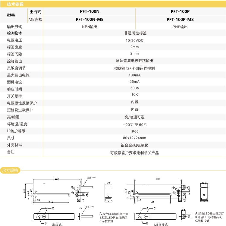ECOTTER 光电标签传感器 PFT-100系列 可以高速检测标签达10Khz,常开常闭可切换,常开是检测到标签输出信号,检测到间隙停止信号;常闭是检测到间隙输出信号,长按设置键8秒切换。