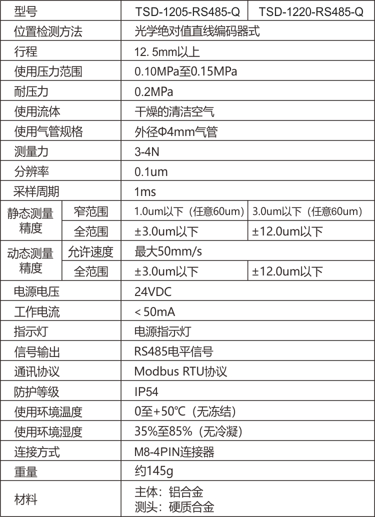 TSD-1205-RS485-Q为气动型,由气管接口可接直径4mm气管,通0.12~0.17mpa气压推出探杆,测量精度可达3um。支持RS485 modbus rtu ,可高速返回数据每秒1000次,实现动态测量。
