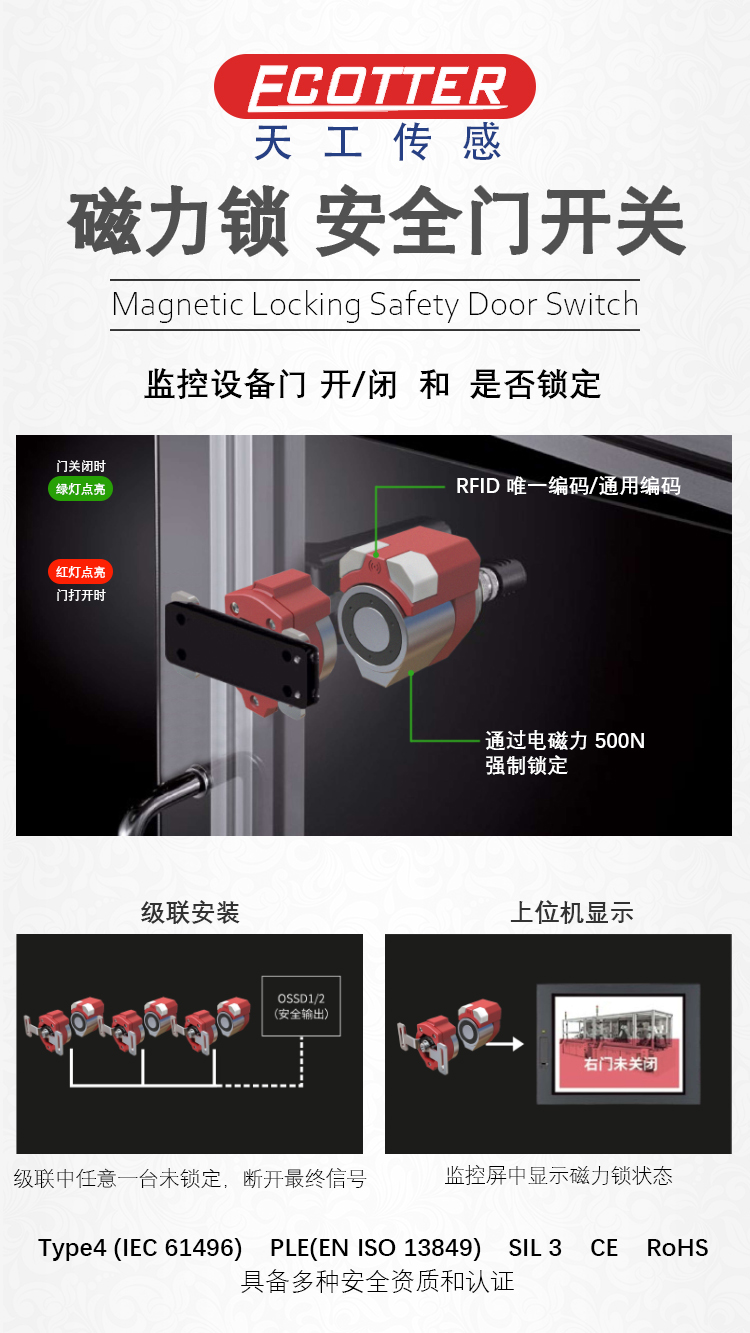 ML-500系列具有Type4 (IEC 61496)、PLE(EN ISO 13849)、SIL 3、CE、RoHS等多种安全资质和认证,使用更放心。其锁定力可达500N,具有抗干扰、防尘防水、耐腐蚀、高负载,适用于高安全性和恶劣工况需求。