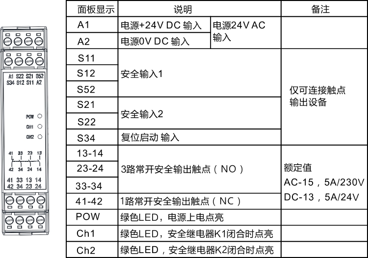 SRS-226-2N/P-3NO1NC是一款适用于具有开关量的安全产品输入,具有3路常开(NO)安全输出触点和1路常闭(NC)辅助输出触点的安全继电器。它可选择单/双通道操作,手动/自动复位。